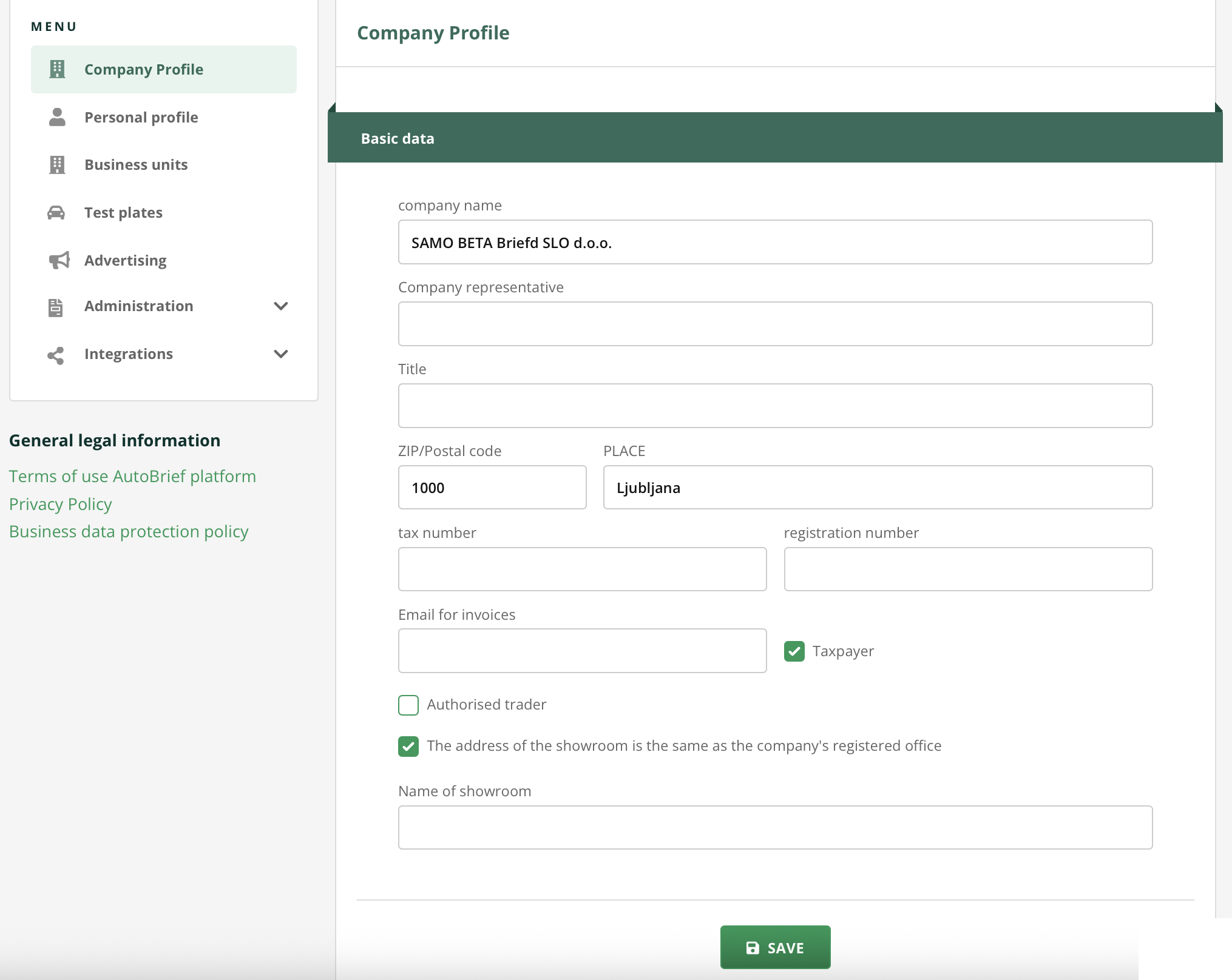 All changes within the company settings must be saved by clicking the SAVE.
