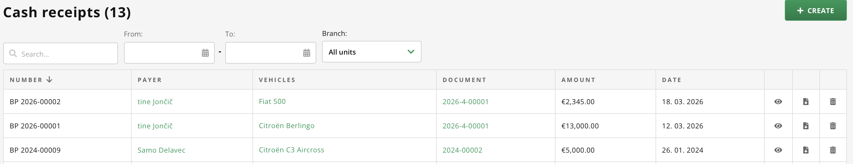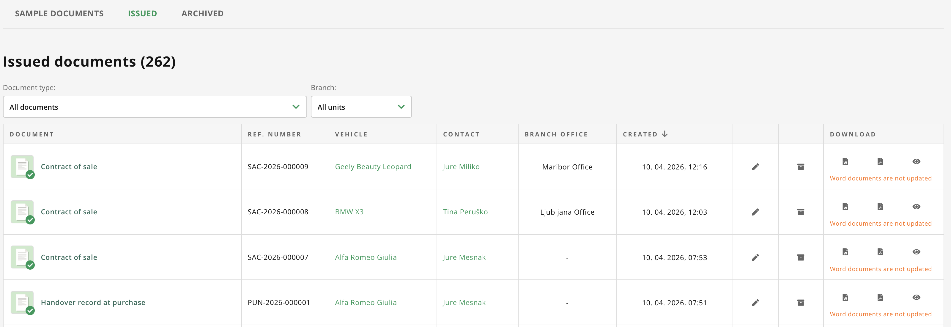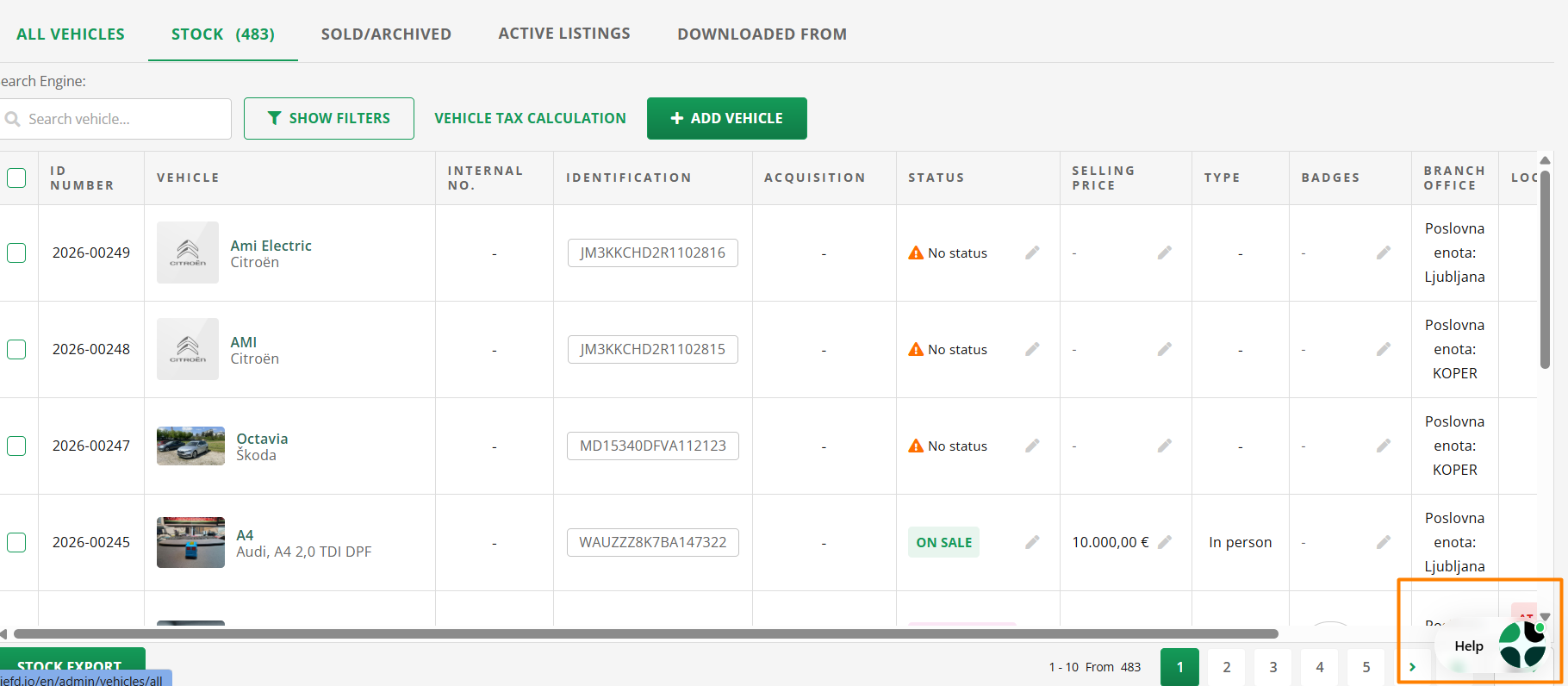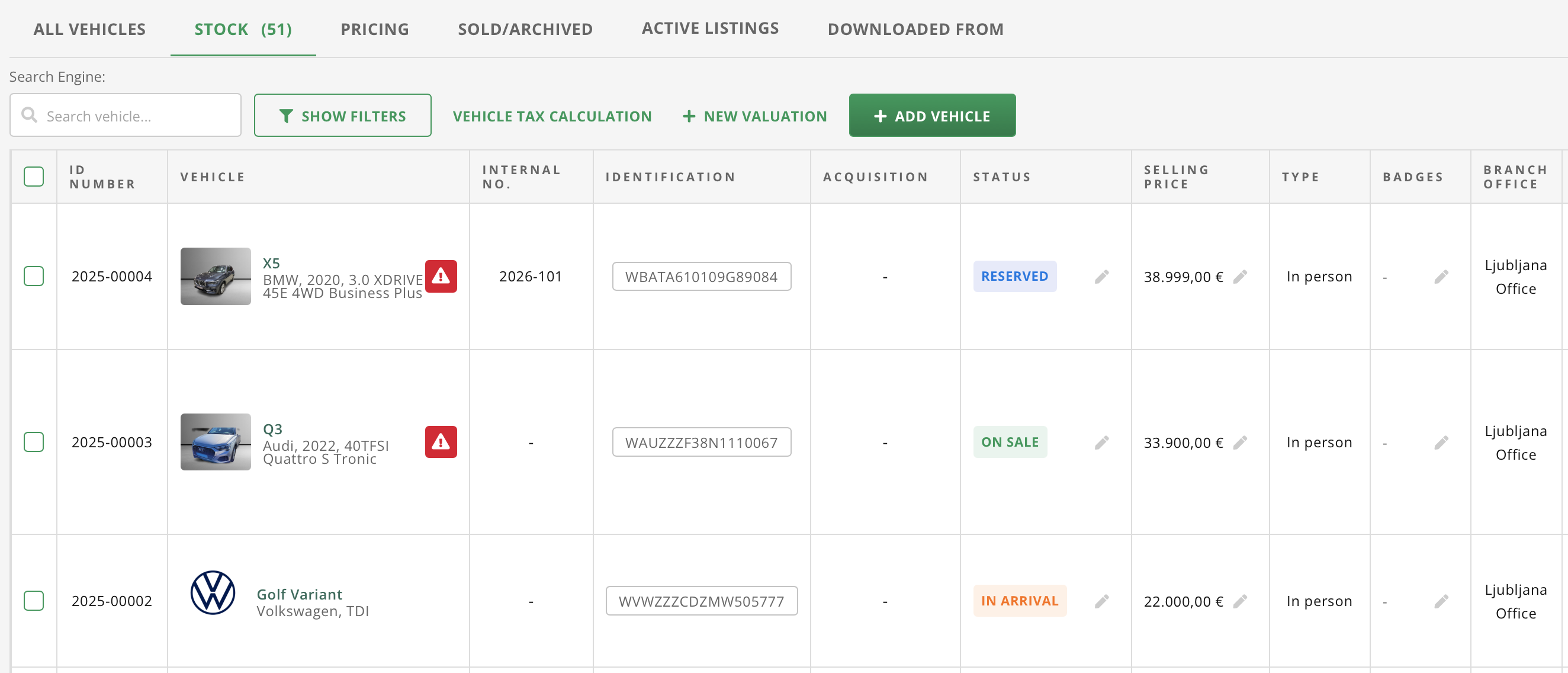 The Vehicles module contains the inventory of all vehicles in the company. Here you add new vehicles, edit data, monitor costs, and prepare vehicles for sale or advertising.