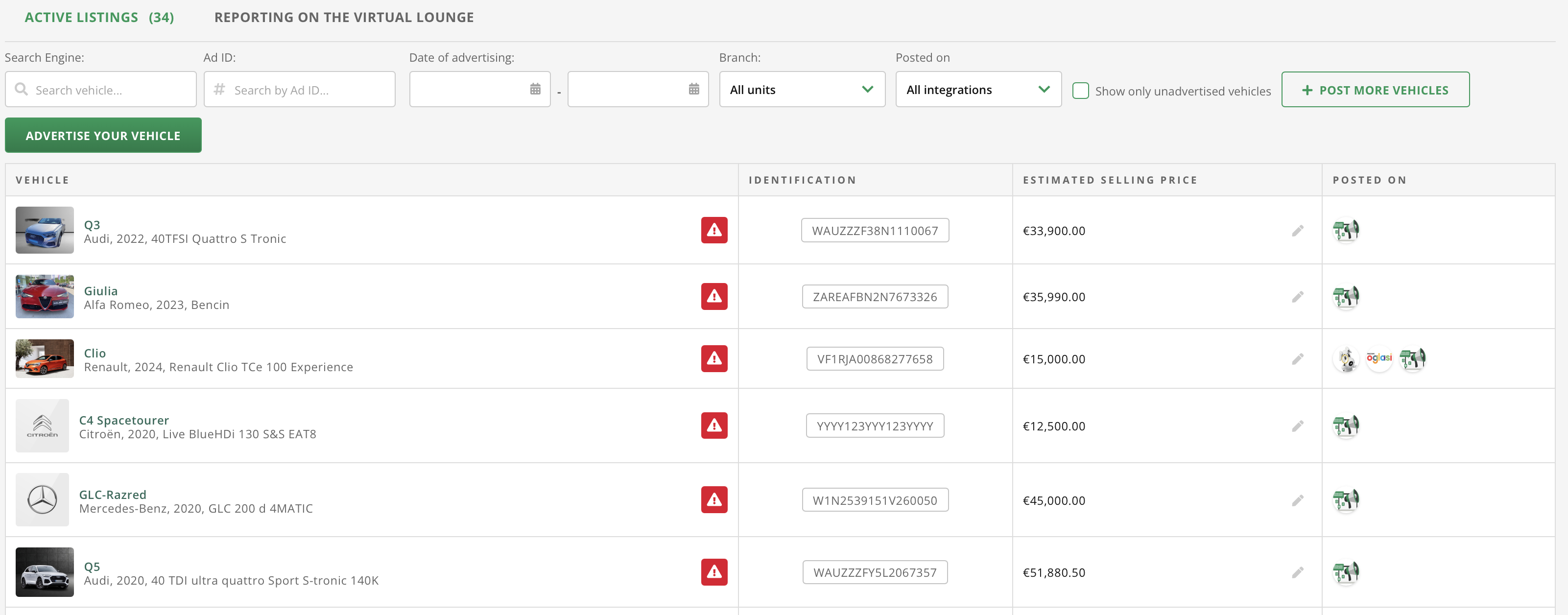 The Advertising module offers vehicle publication on the most visited ad portals and social networks. Manage ads, refresh posts and track their performance.