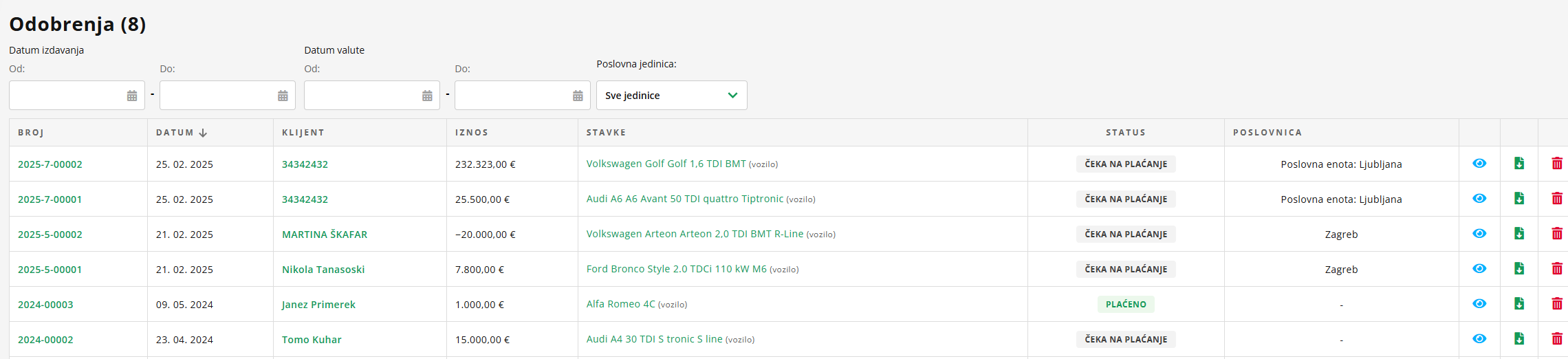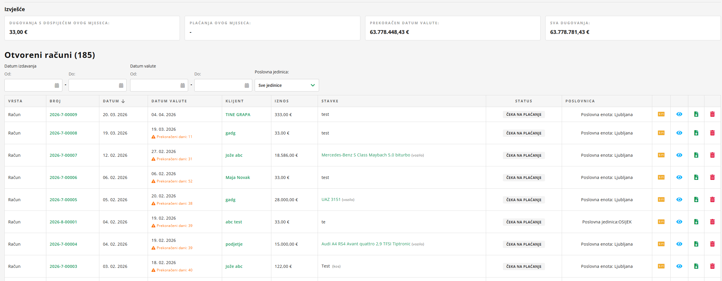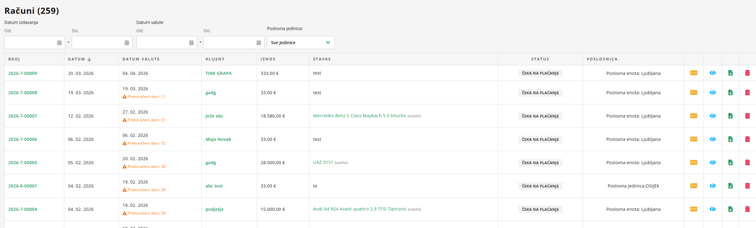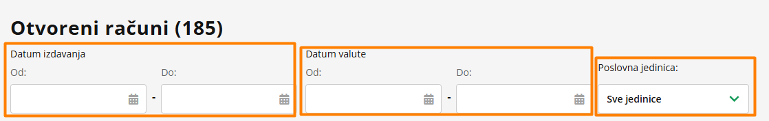 U gornjem retku imate mogućnost filtriranja računa po datumu izdavanja, po datumu valute te po poslovnoj jedinici, ako ih imate više.