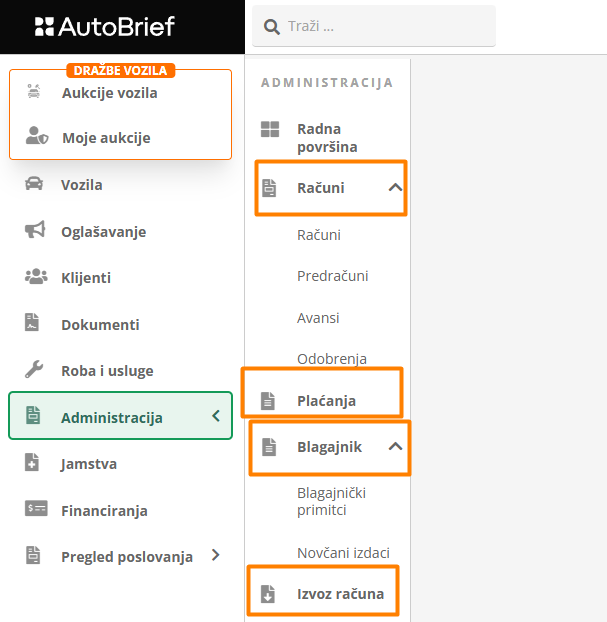 Modul Administracija, koji sadrži sve račune i predstavlja jedan od najvažnijih dijelova poslovanja. U AutoBriefu je administrativni proces jednostavniji, jer nema potrebe za dodatnim unosom podataka, budući da sustav sve podatke preuzima iz vozila i kontakta u imeniku.
