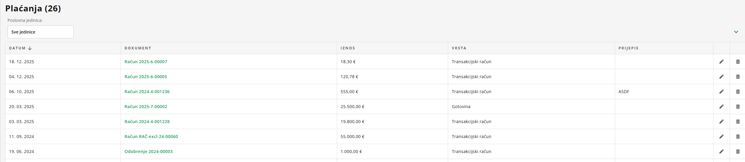 U kartici Plaćanja možete vidjeti sve uplate koje ste unijeli u odjeljku otvorenih računa. Redovitim unosom plaćanja imate pregled svih uplata na jednom mjestu.