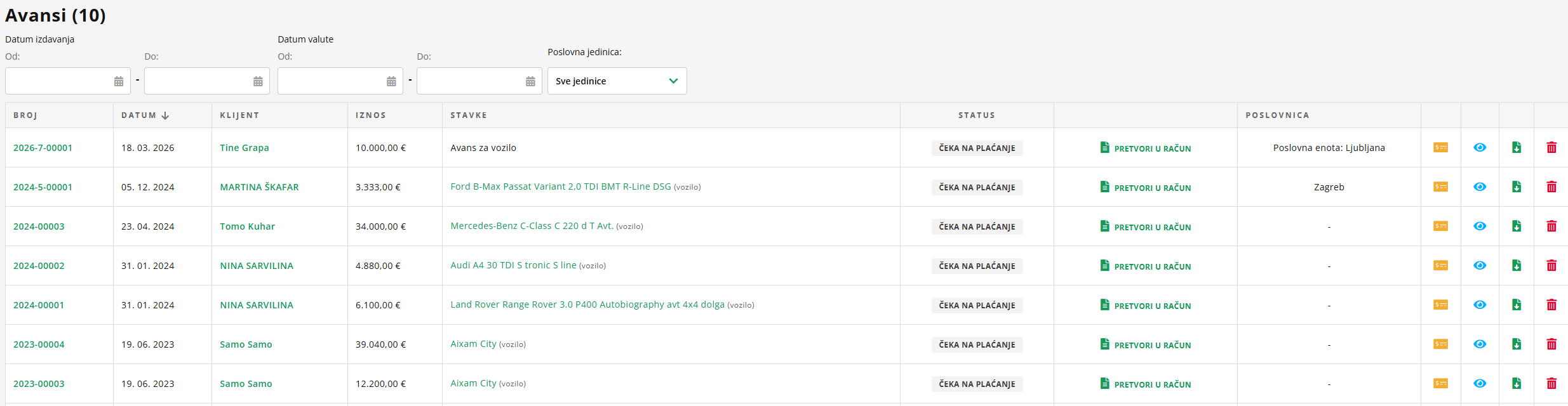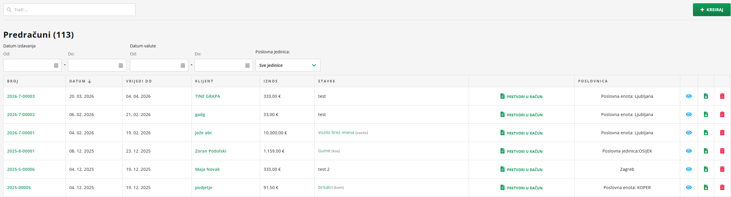 Ako imate više poslovnih jedinica, račune je moguće filtrirati po svakoj jedinici zasebno