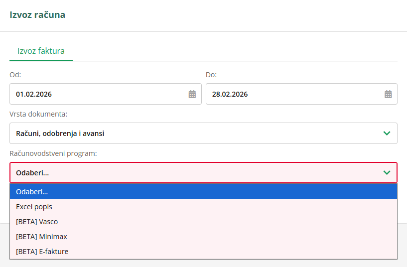 Kartica Izvoz faktura omogućuje vam izvoz računa prema datumu, prema vrsti dokumenta (računi, avans, odobrenja, predračuni) i prema računovodstvenom programu.