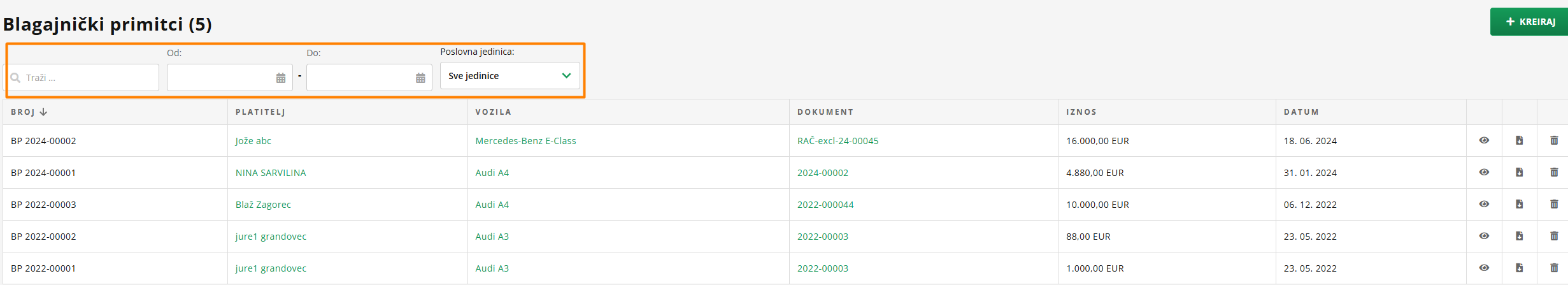 Primitke možete filtrirati po datumu i po poslovnoj jedinici