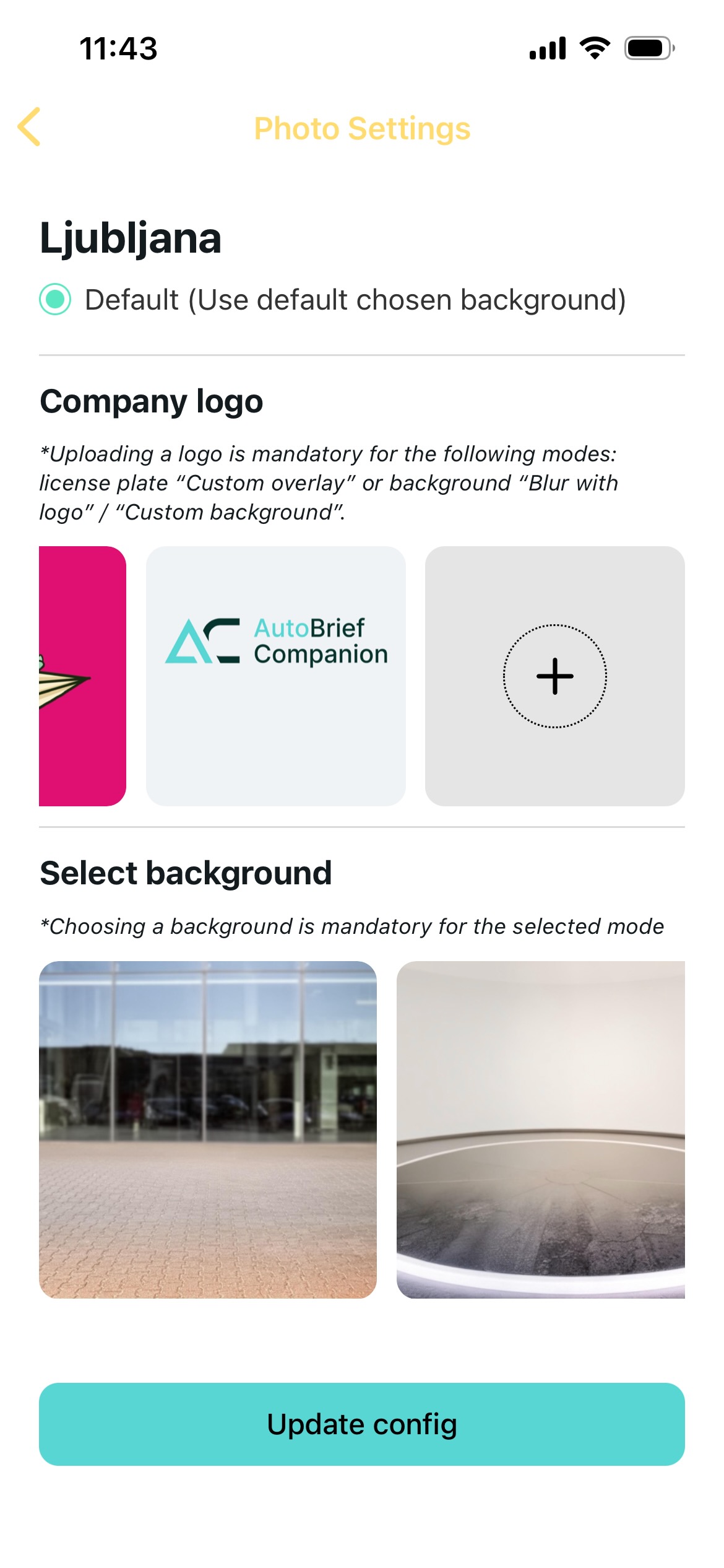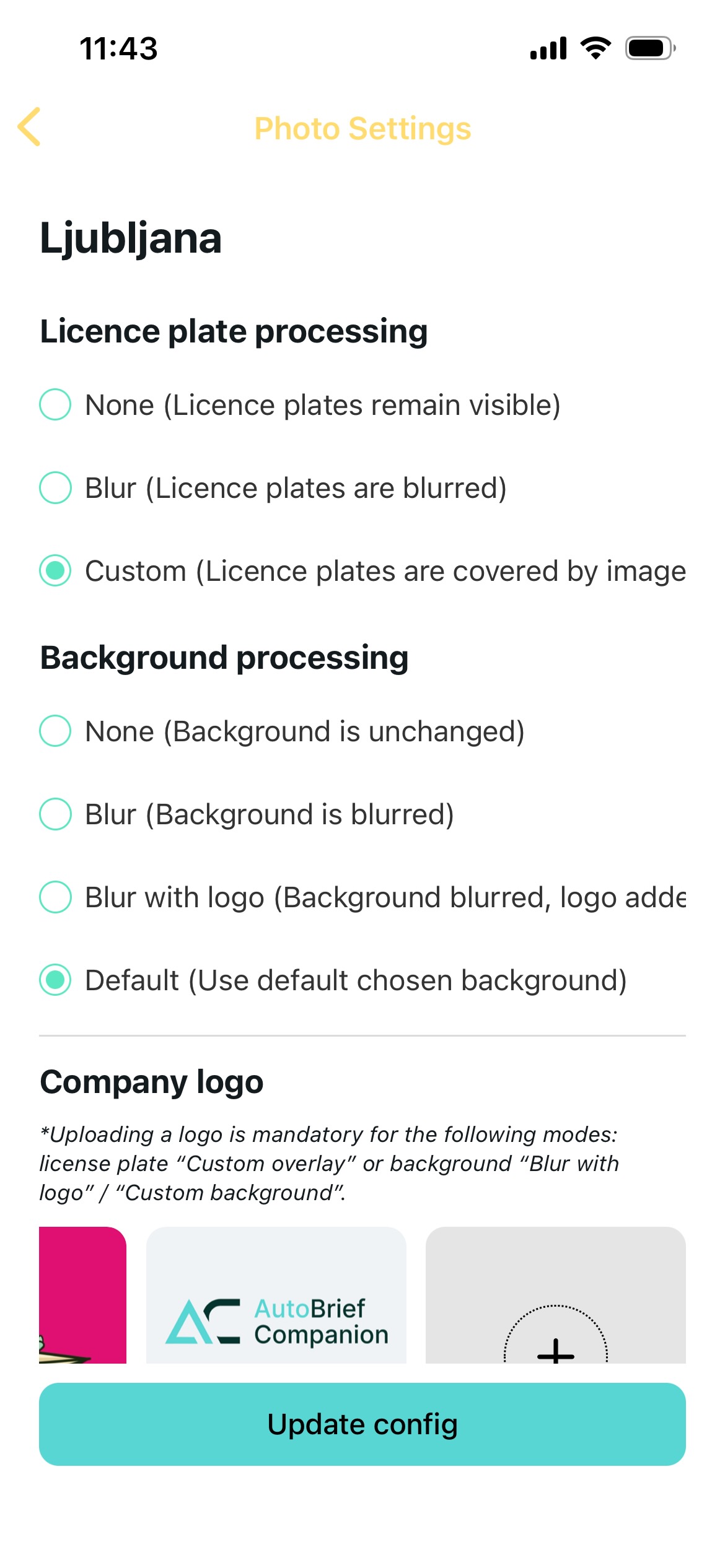 Postavke obrade slika, koje se nalaze pod "Photo Settings" unutar "Companion App Settings", određuju kako će se obrađivati fotografije vozila. Ove postavke dostupne su za pojedine lokacije u AutoBriefu i možete ih postaviti: