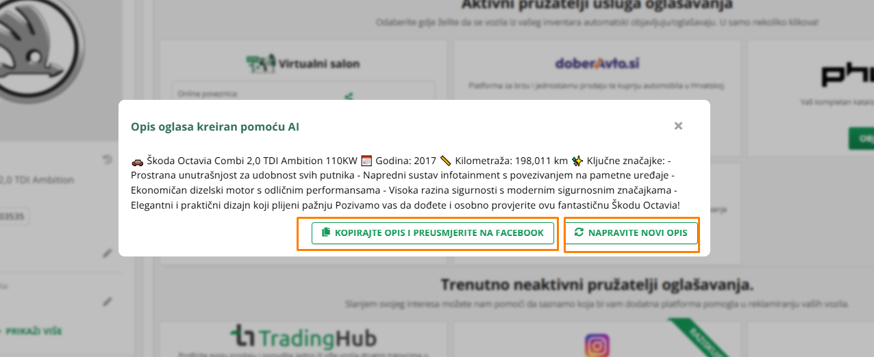 - Generirajte tekst s AI. AI pripremi atraktivan tekst temeljen na podacima vozila.