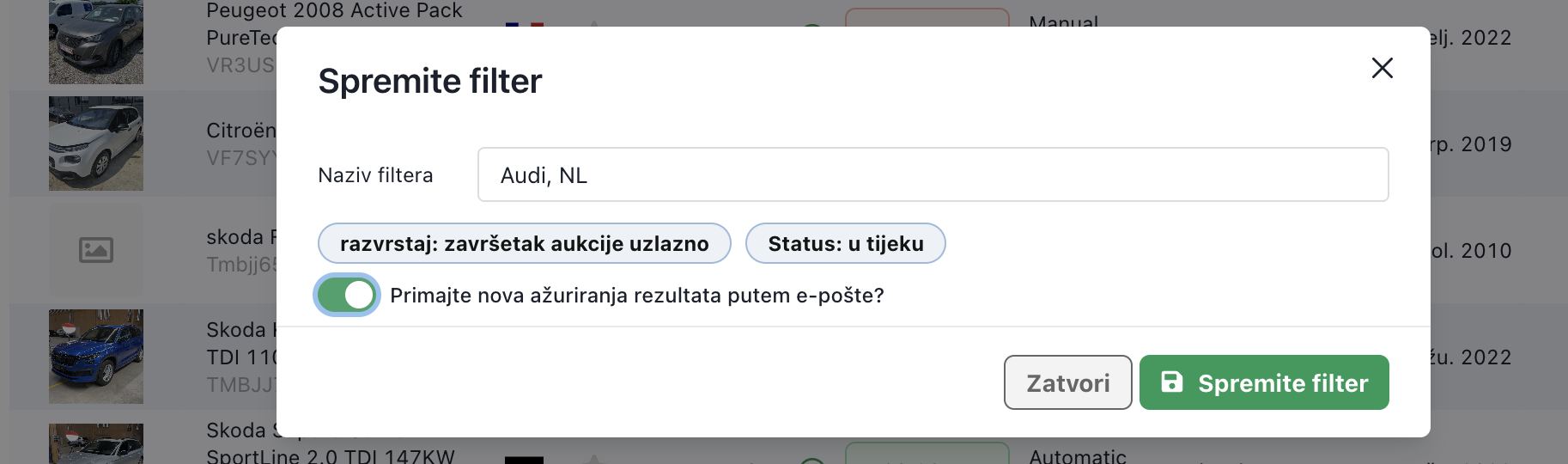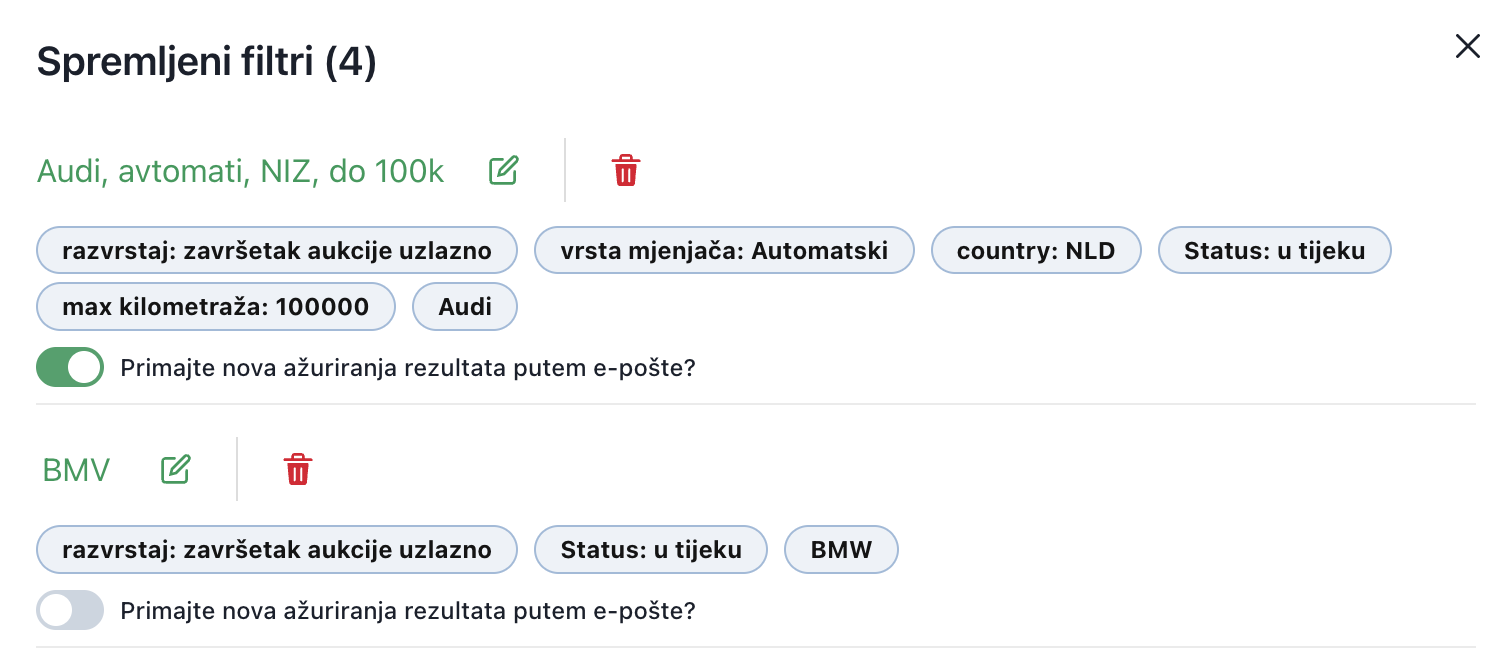 Spremljeni filter prikazat će se i među filtrima na vrhu stranice. Kada sljedeći put otvorite aukcije, moći ćete brzo pretraživati vozila prema spremljenim filtrima. Dovoljno je odabrati filter koji ste prethodno izradili.