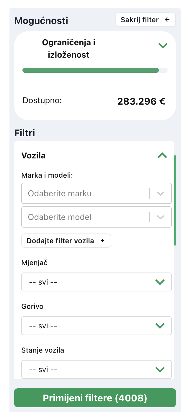 Kod pretraživanja vozila možete koristiti sljedeće filtre: