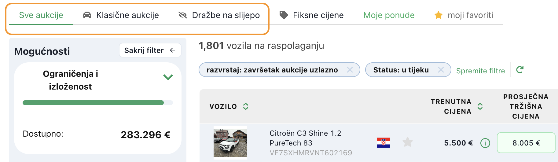 Za brži pregled vrsta aukcija koje vas zanimaju, možete koristiti filtre u gornjem lijevom kutu zaslona. Tamo možete odabrati želite li pratiti samo klasiščne aukcije, slijepe ponude ili vozila s fiksnom cijenom - ovisno o vašoj strategiji kupnje.