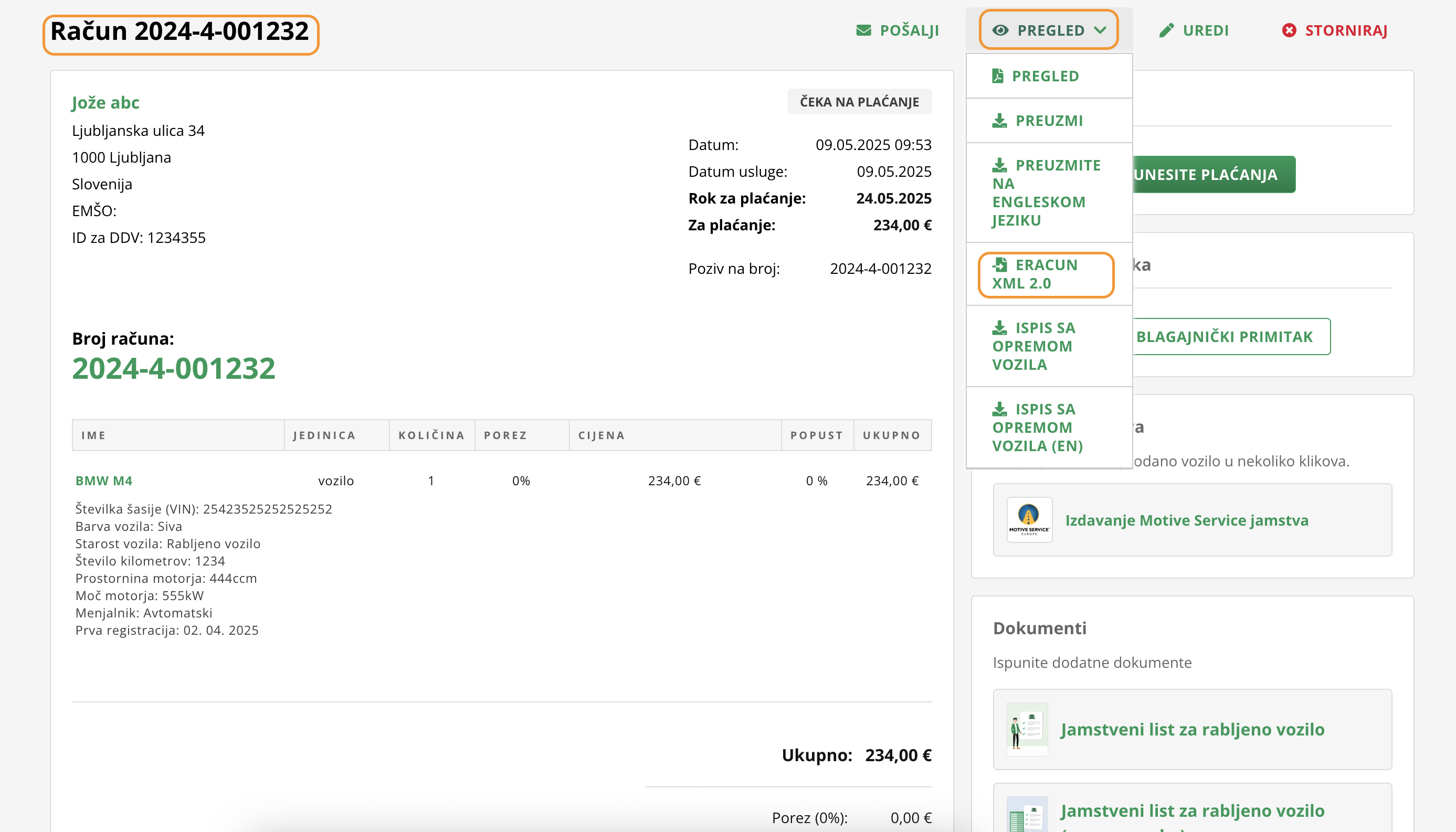 U svakom pojedinačnom računu jednostavno imate mogućnost da ga izvezete kao e-račun i proslijedite svojoj računovodstvenoj službi ili partneru. To učinite tako da otvorite račun, kliknete gore desno na "Pregled", a u padajućem izborniku odaberete opciju E-račun XML 2.0. Klikom na ovu opciju, e-račun će se preuzeti na vaš uređaj.