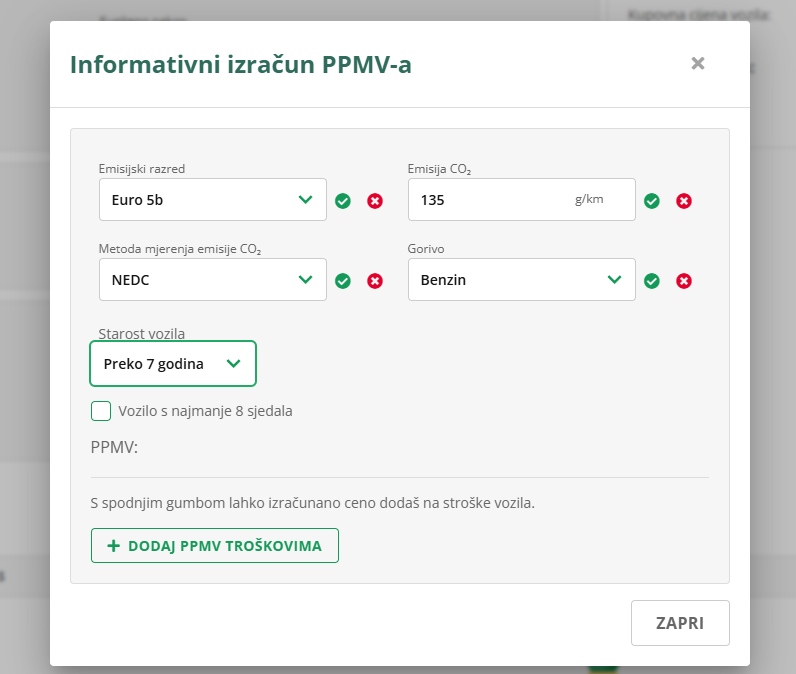 Odaberite vozilo za koje želite izračunati DMV i unesite potrebne podatke (starost vozila, emisijski razred, emisije CO₂, način mjerenja CO₂ emisija i vrsta goriva).