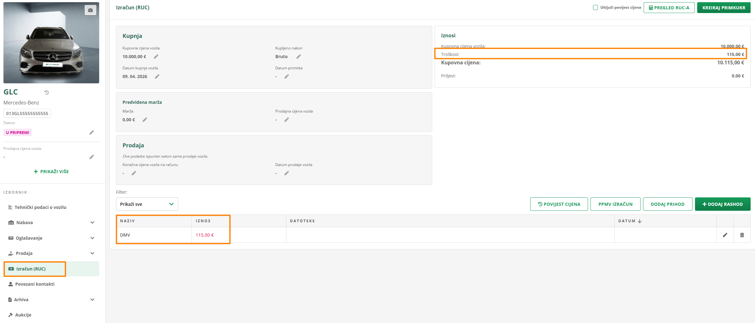 Troškove ćete pronaći ako na vozilu u lijevom izborniku odaberete Izračun (RUC). Ispod su navedene sve stavke troškova, uključujući i izračun DMV-a. Također, gore desno je zbroj svih troškova.