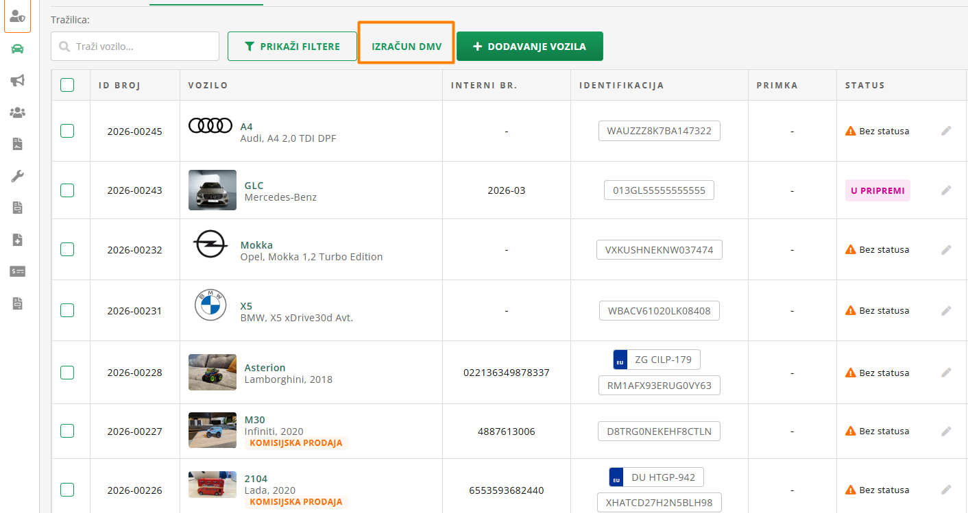 Unutar modula Vozila kliknite na + DMV IZRAČUN u gornjem dijelu kartice.