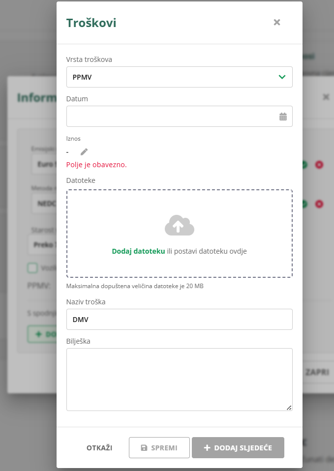 DMV možete klikom na gumb + DODAJ DMV NA TROŠKOVE dodati među troškove koji će se uzeti u obzir pri kalkulaciji prodajne cijene.