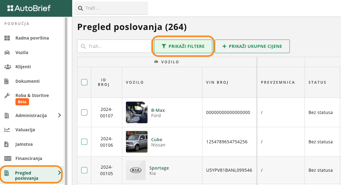 U modulu "Pregled poslovanja" postavite filtere koje želite primijeniti na pregled zalihe klikom na "Prikaži filtere" s desne strane pretraživača.