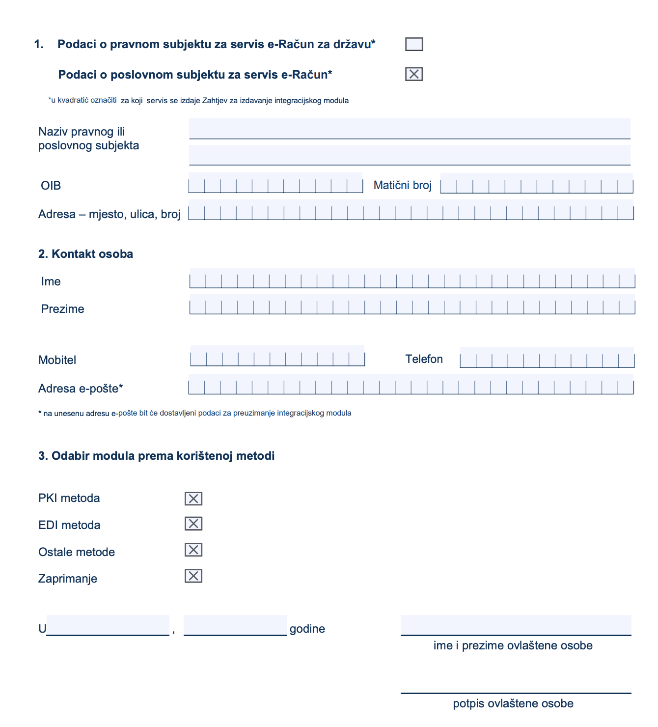 - Kod točke 1 potrebno je staviti znak X na stavku Podaci o poslovnom subjektu za servis e-Račun.