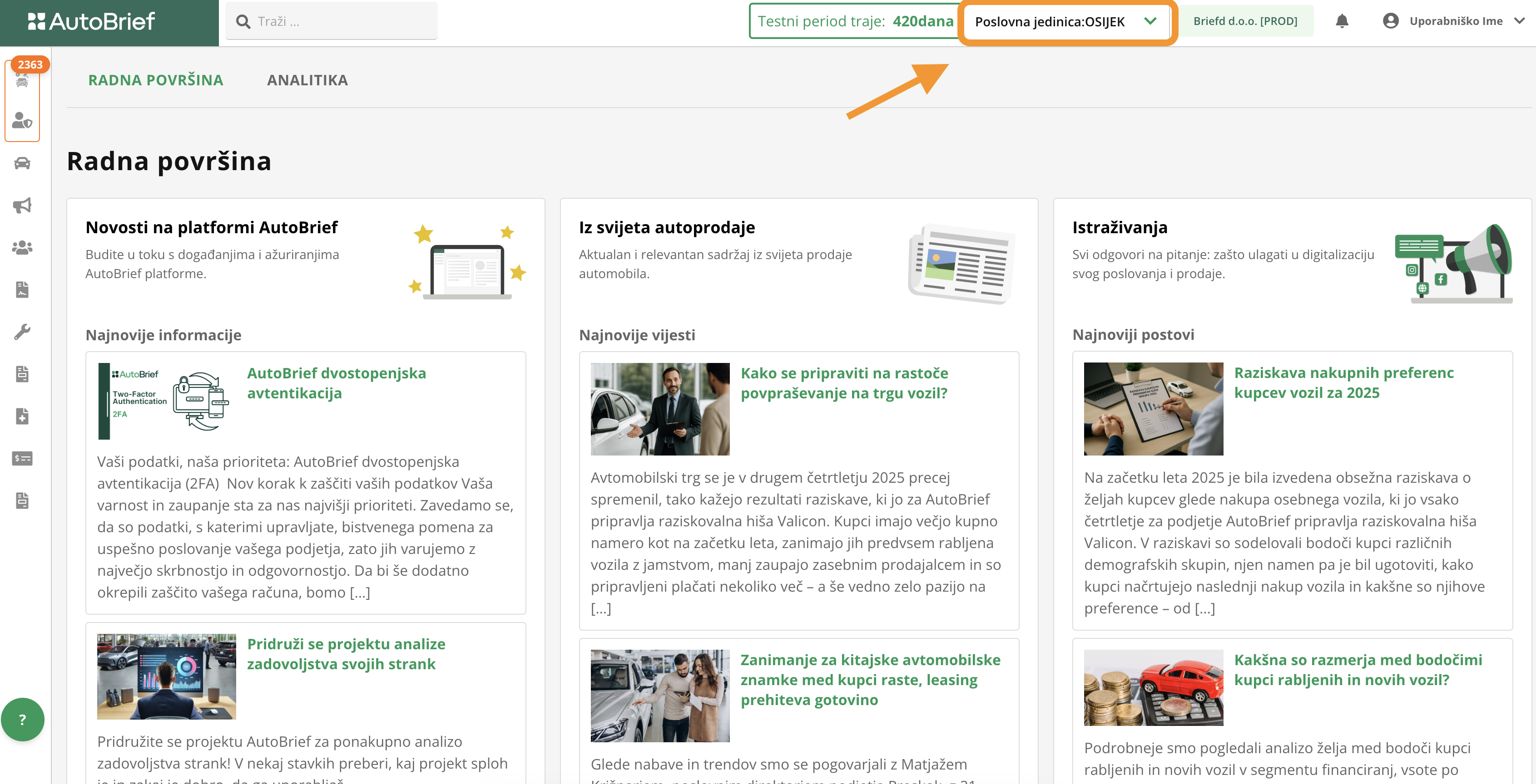 Odabrana poslovna jedinica bit će prikazana u gornjem izborniku.