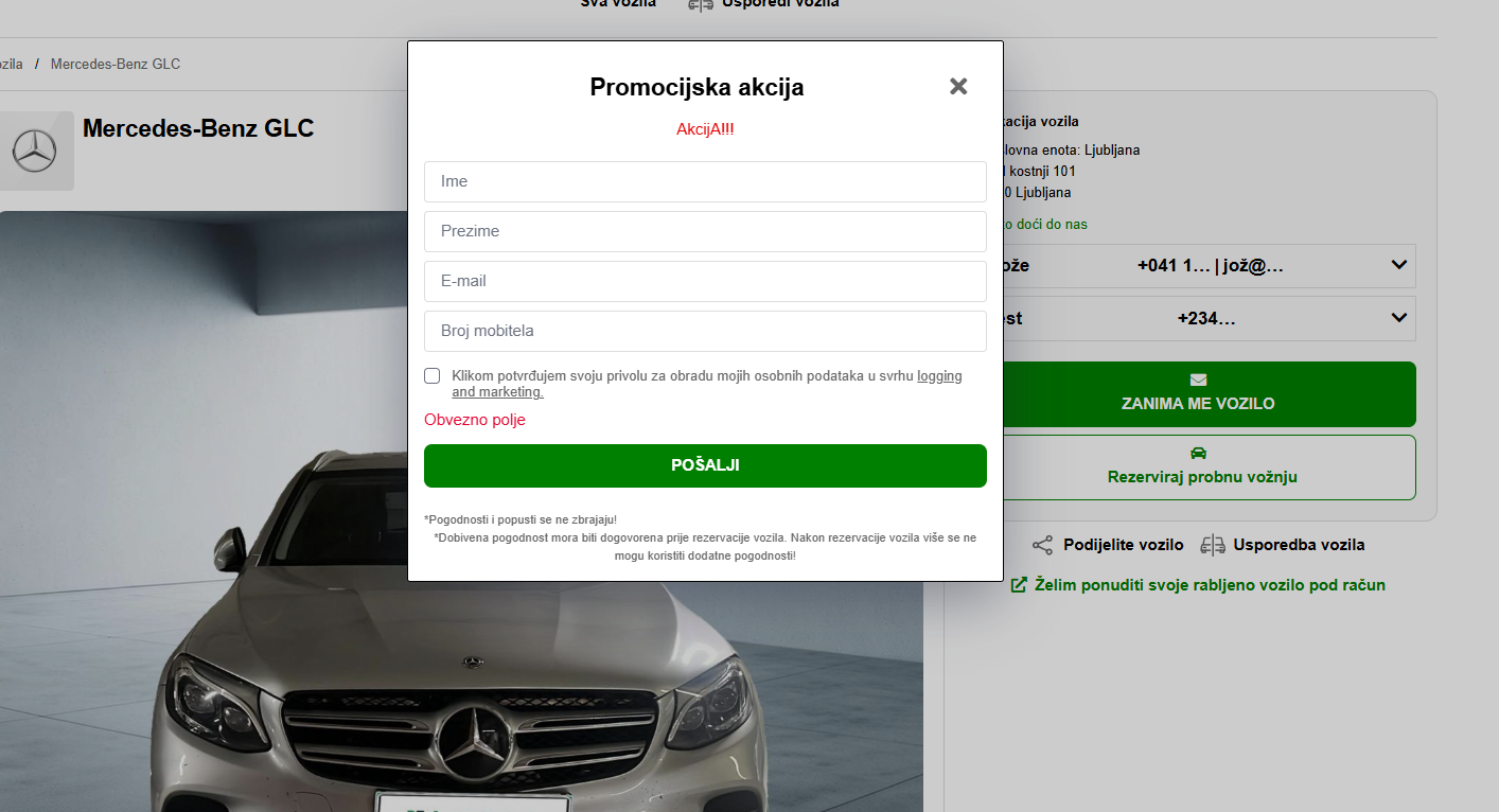 U njemu potencijalni kupac ispunjava svoje osobne i kontakt podatke (telefon i e-mail). A vi točno znate koje ga vozilo zanima i kako ga kontaktirati.