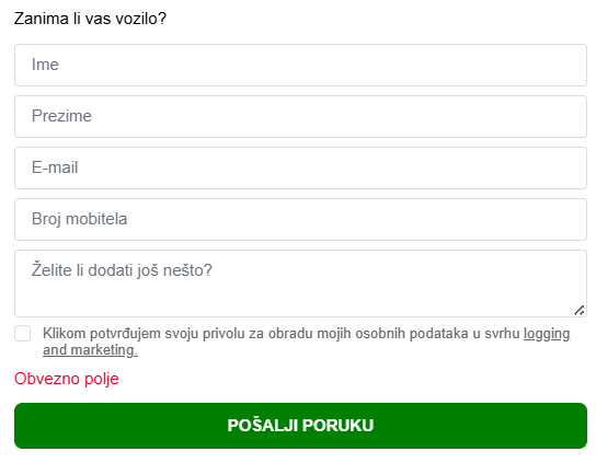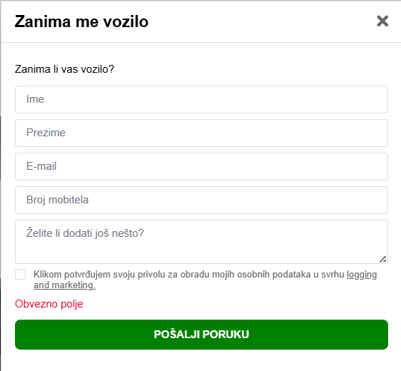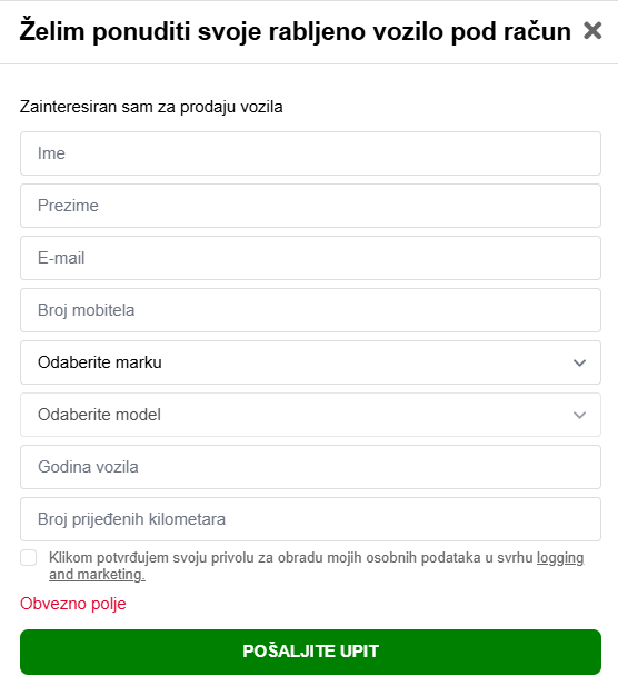 Unutar obrasca potencijalni kupac, osim svojih kontaktnih podataka, ispunjava i kakvo vozilo ima, godište vozila, marku i model te broj prijeđenih kilometara.