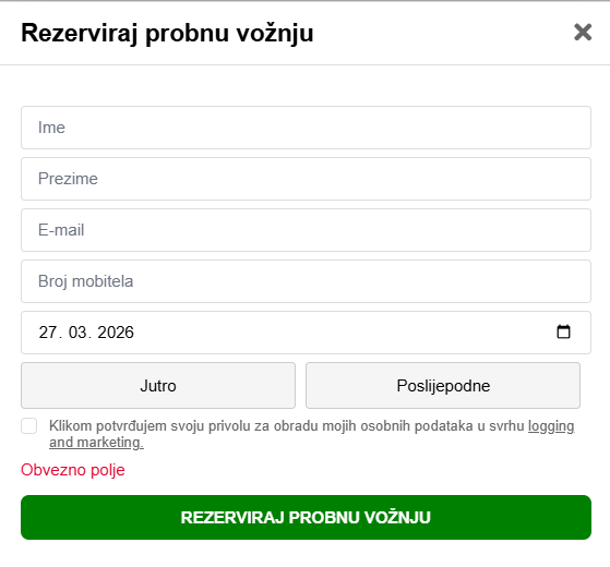 Obrazac se sastoji od imena i prezimena potencijalnog kupca, e-maila i broja mobitela te datuma, kada bi želio doći na probnu vožnju. Može odabrati i opciju prijepodne ili poslijepodne.