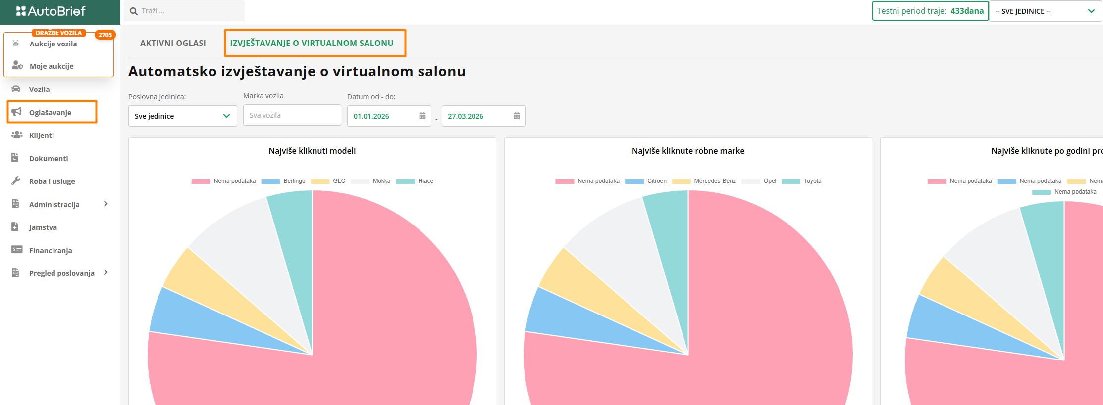 Ako imate objavljeno barem jedno vozilo u Virtualnom salonu, dostupna su vam tri izvješća o: