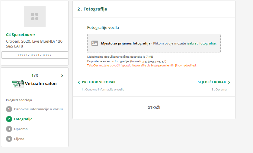 U drugom koraku možete dodati fotografije vozila, koje želite oglašavati. Fotografije nisu obvezne, ali uvelike pridonose brzoj prodaji vozila. Kliknite NASTAVI.