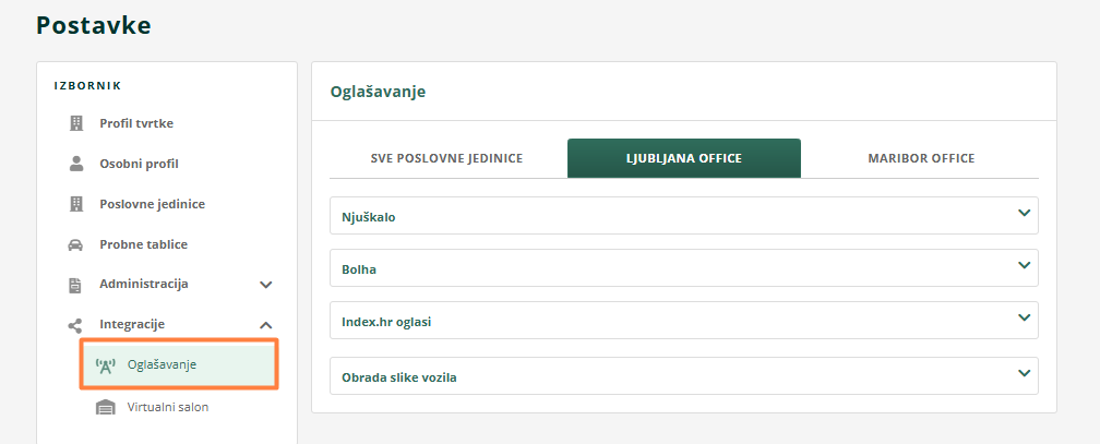 Doberavto.si i dodatak Quick Entry moguće je postaviti samo za sve poslovne jedinice zajedno, dok za Njuškalo, Shopaj, Bolha i Index možete postaviti za svaku poslovnu jedinicu zasebno, ako kod nje dodate samostalan račun za oglašavanje.