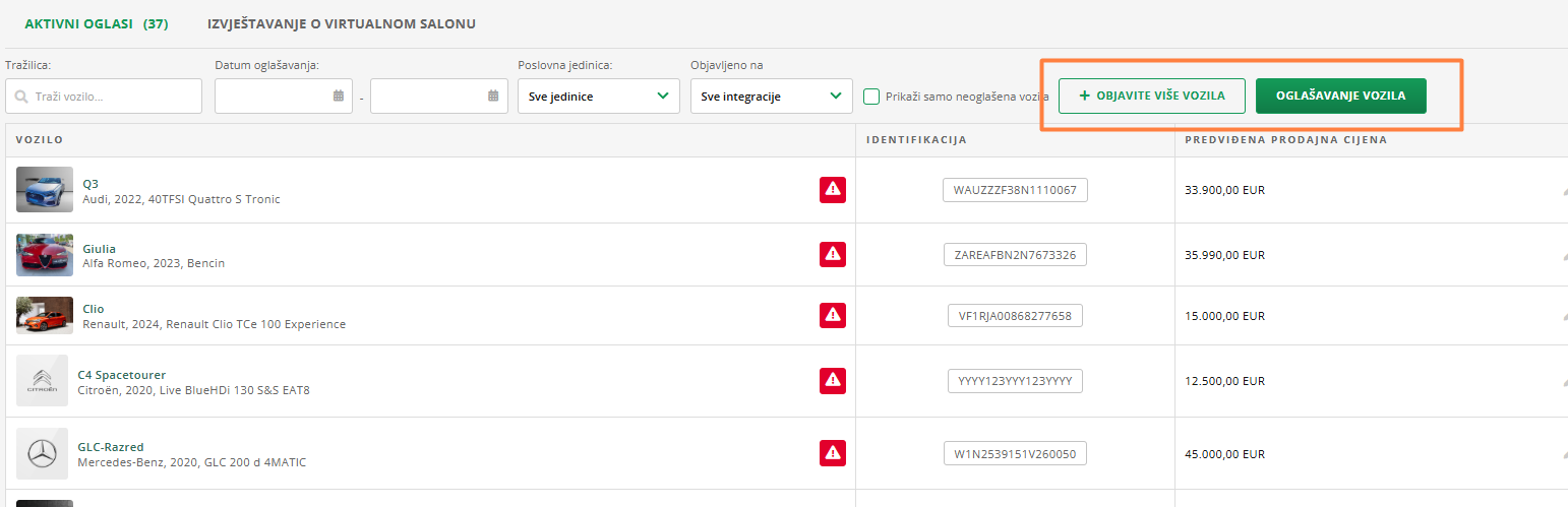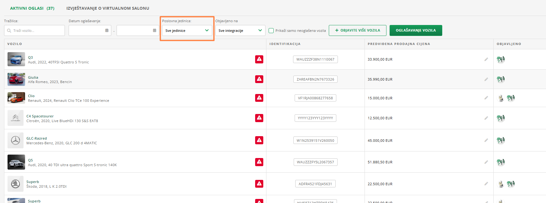 Koja vozila oglašavate, na kojoj poslovnoj jedinici, moguće je vrlo jednostavno pratiti u modulu Oglašavanje. Među filtrima u gornjem retku moguće je jednostavno birati između prikaza svake pojedine poslovne jedinice, ili svih zajedno.