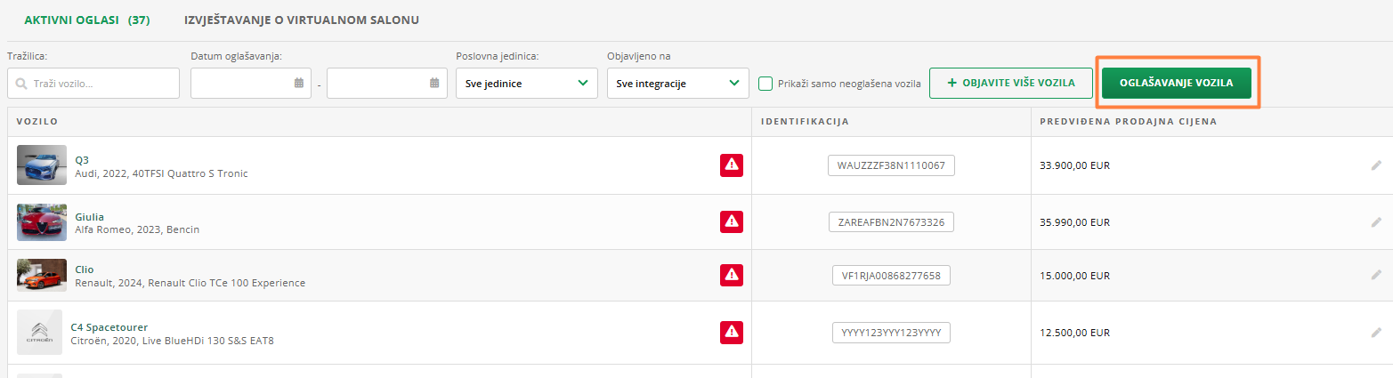 - U gornjem desnom kutu modula odaberite gumb OGLAŠAVANJE VOZILA.