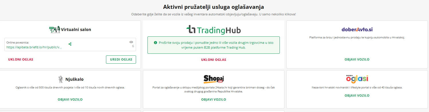 Modul Oglašavanje na platformi AutoBrief namijenjen je tome da možete jednostavno i brzo oglašavati sva vozila na brojne oglasne portale i društvene mreže. AutoBrief omogućuje izravne objave vozila na Doberavto.si, portal Bolha, Njuškalo, Shopaj24, Index.hr, Facebook katalog i na predstavljanje vlastite zalihe kroz Virtualni salon.