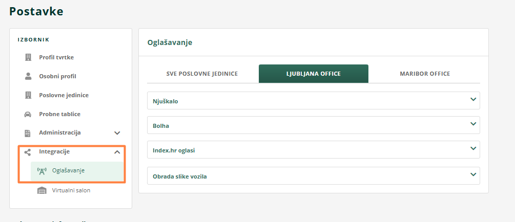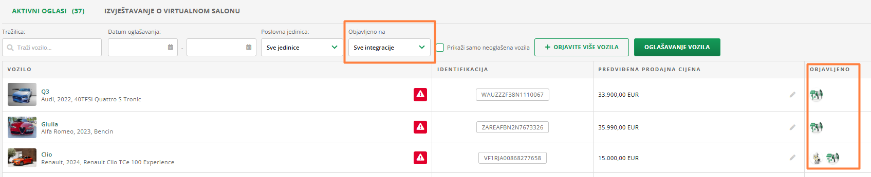 Unutar modula Oglašavanje moguće je filtriranje prema datumu oglašavanja te prema integraciji, na kojoj ste objavili vozilo. Ako želite pronaći specifično vozilo, možete njegovo ime upisati u tražilicu. Klikom na kućicu "Prikaži samo neoglašena vozila", sustav će vam prikazati samo vozila koja još ne oglašavate.