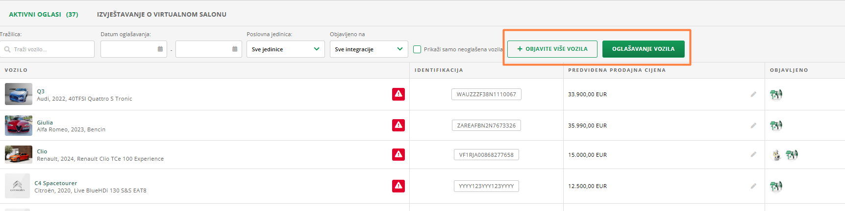 - Otvara se popis svih vozila koja već oglašavate.