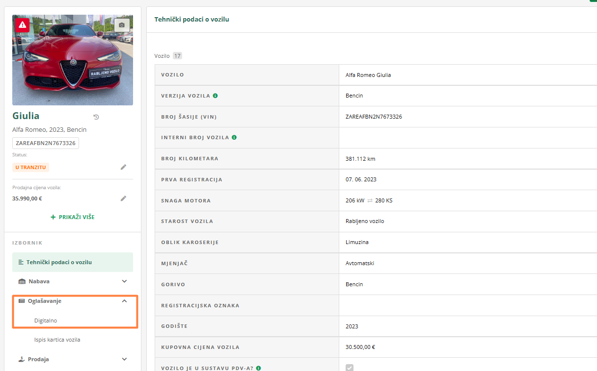 - Idite na "Vozila" i otvorite karticu vozila koje želite oglašavati.