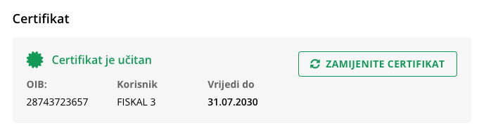 ⚠️ Napomena: Ako ste već koristili certifikat za fiskalnu blagajnu, morate ga ponovno učitati – sustav sada koristi novi način spremanja certifikata, kako bi bio ispravno potvrđen prema novom zakonu.