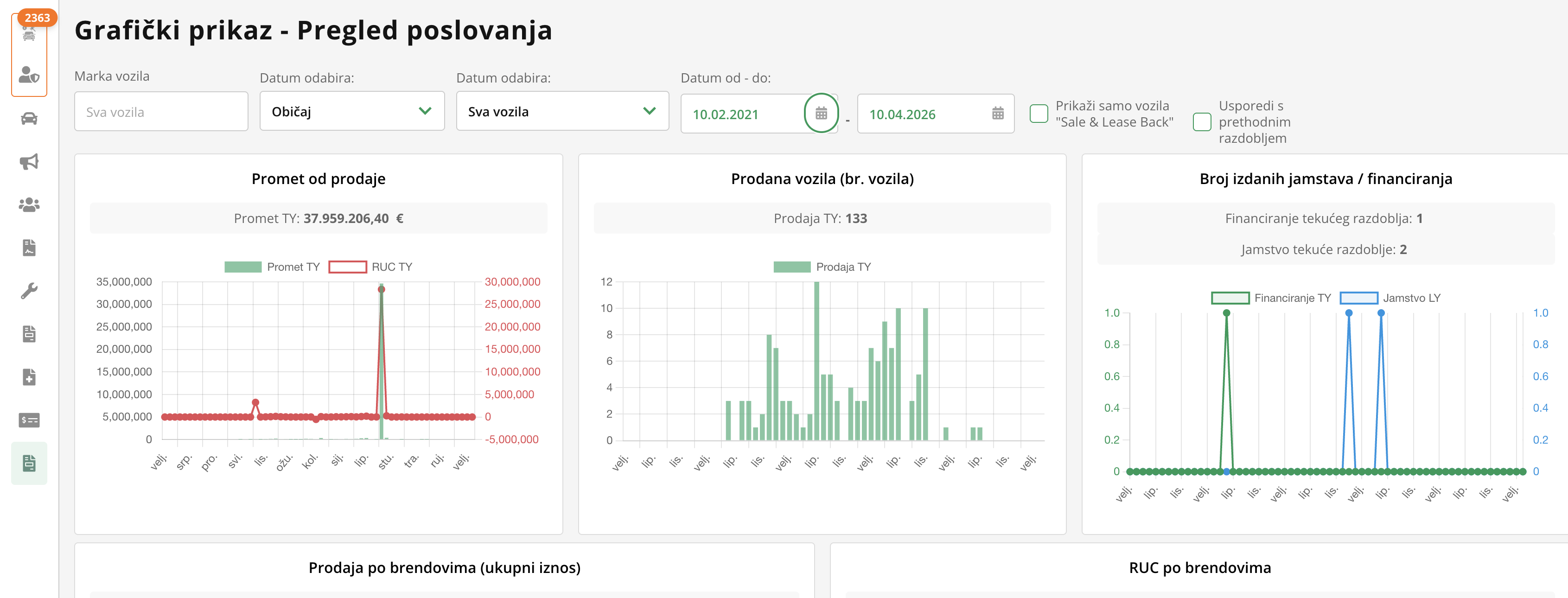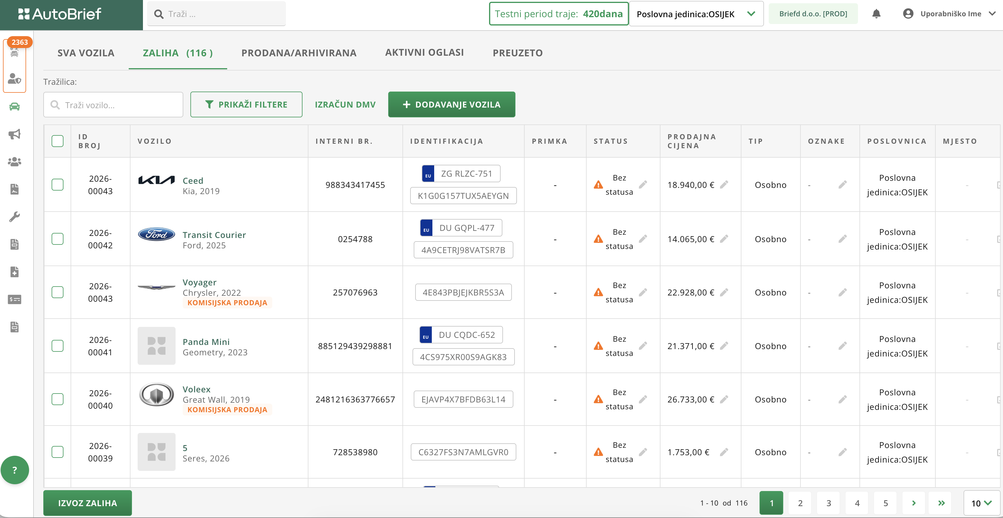 U modulu Vozila nalazi se zaliha svih vozila u tvrtki. Ovdje dodajete nova vozila, uređujete podatke, pratite troškove i pripremate vozila za prodaju ili oglašavanje.