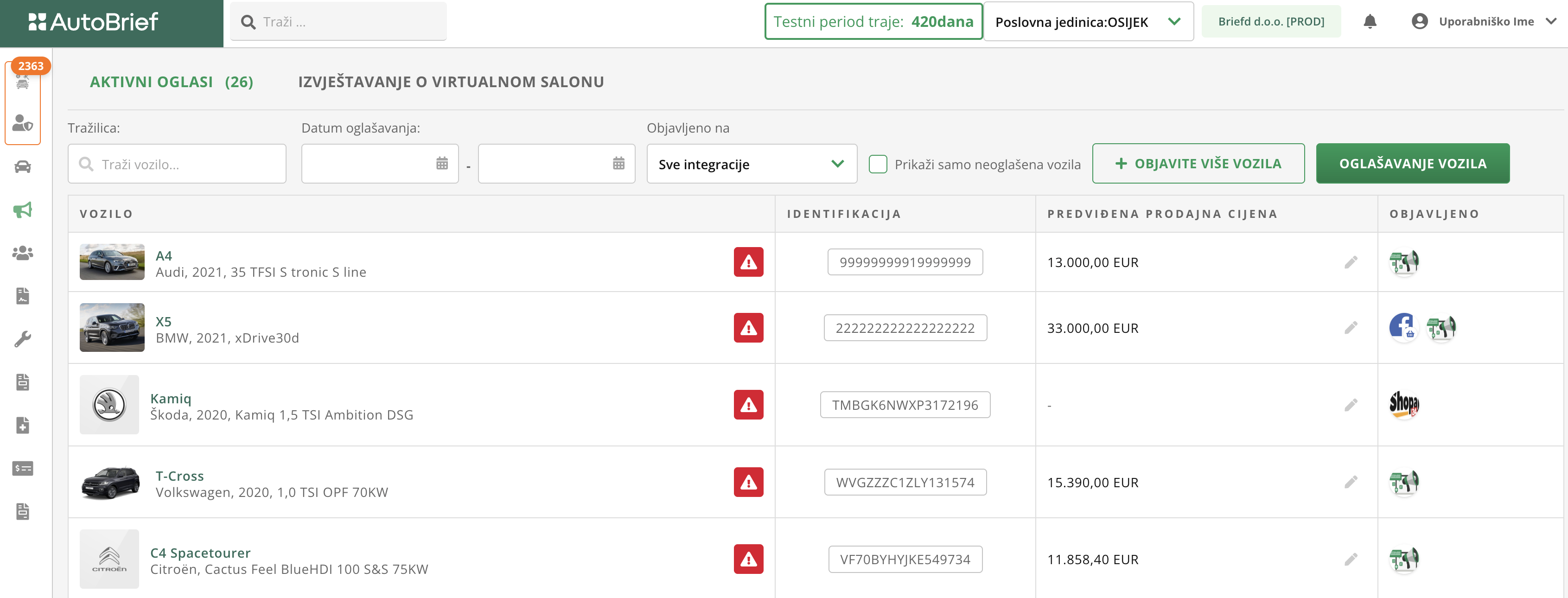 Modul Oglašavanje nudi objavu vozila na najposjećenijim oglasnim portalima i društvenim mrežama. Upravljajte oglasima, osvježavajte objave i pratite njihovu uspješnost.