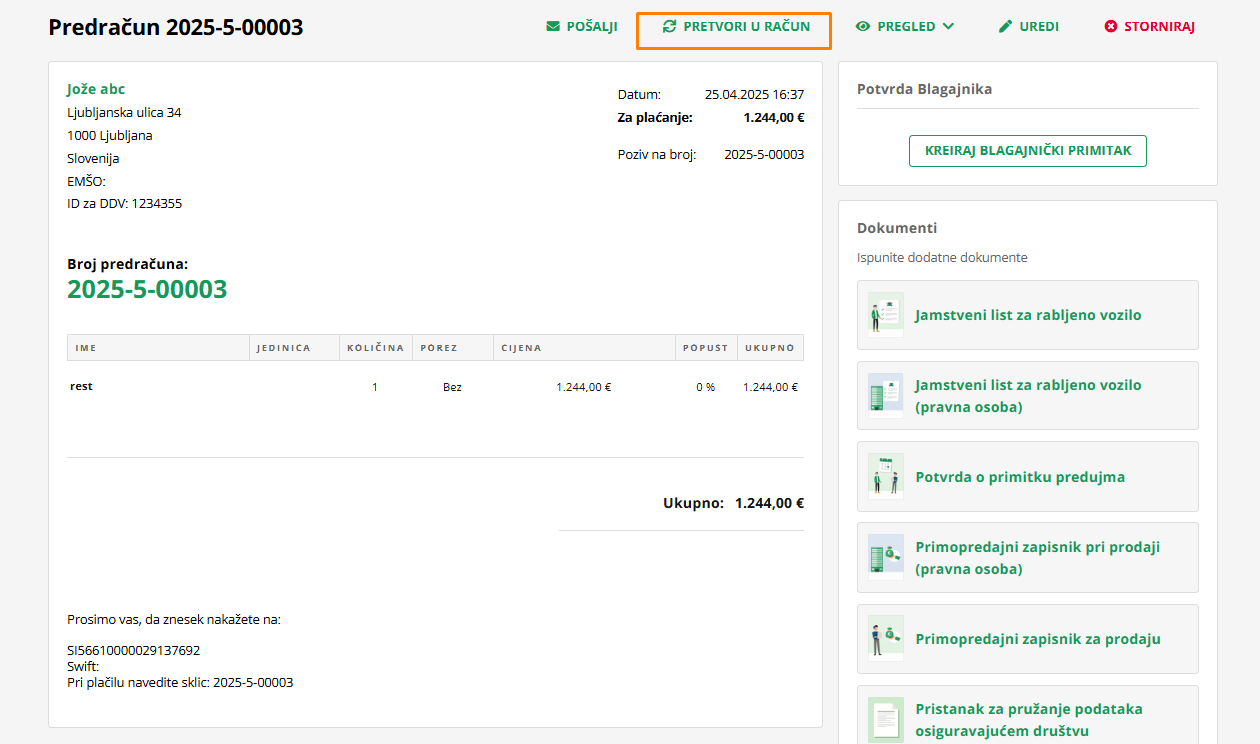 ⚠️ Pretvaranjem predračuna se automatski prenose sve stavke i podaci o kupcu. Izvorni predračun ostaje arhiviran.