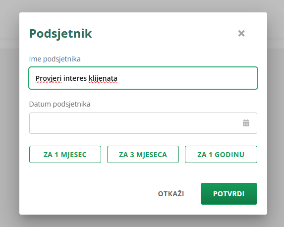 U naslov podsjetnika upišite kratku poruku koja će vas podsjetiti na aktivnost koju želite izvršiti. Odaberite datum kada želite biti obaviješteni i kliknite POTVRDI. Na odabrani datum AutoBrief će vas obavijestiti o potrebnoj akciji. Tako ćete imati potpun pregled svojih zaduženja i zadataka.
