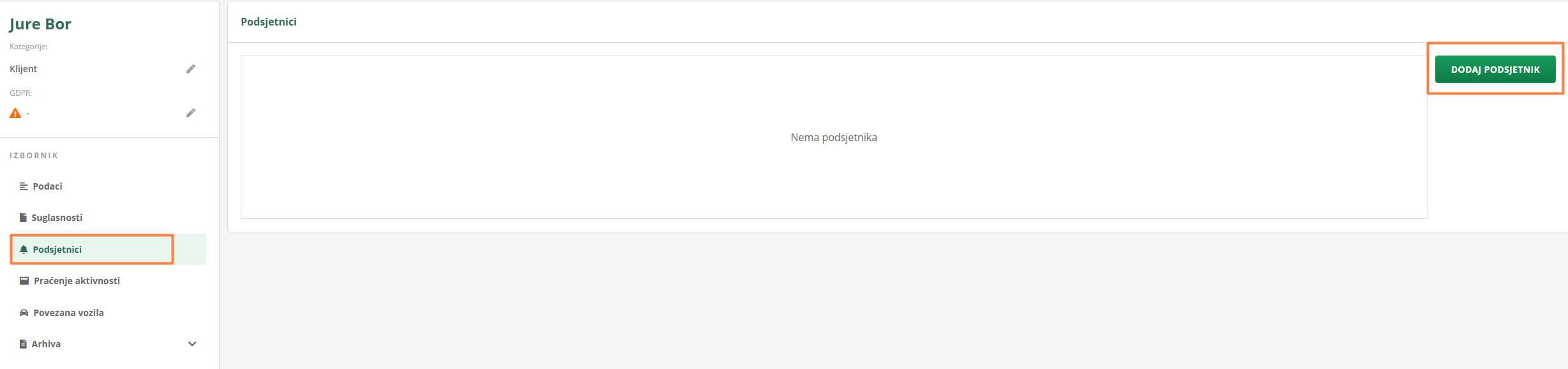 U Imeniku odaberite kontakt za koji želite postaviti podsjetnik. Kliknite na gumb DODAJ PODSJETNIK.