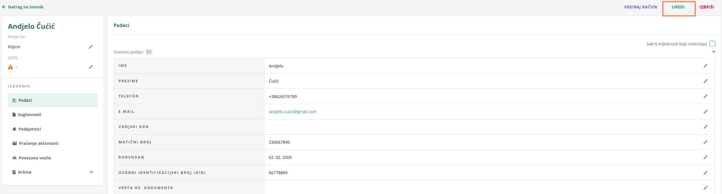 Drugi način, koji vam omogućuje uređivanje svih podataka odjednom, je klikom na UREDI u gornjoj traci.