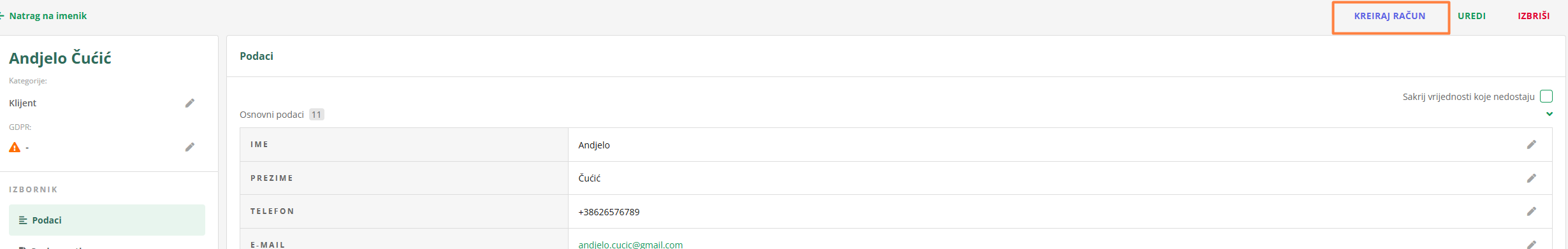 Kliknite na kontakt za koji želite izdati račun. U gornjoj traci kliknite IZRADI RAČUN.