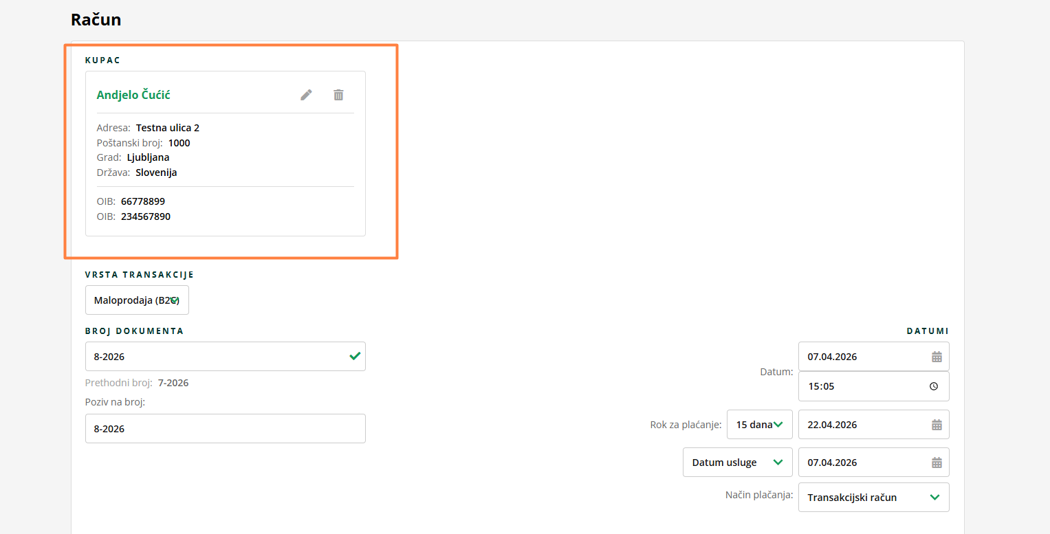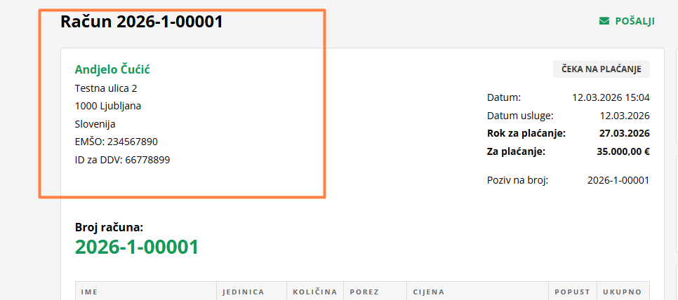 Kada kliknete na RAČUN, otvorit će vam se obrazac računa, pri čemu ne trebate unositi podatke o kupcu jer će se oni popuniti izravno iz kontakta.