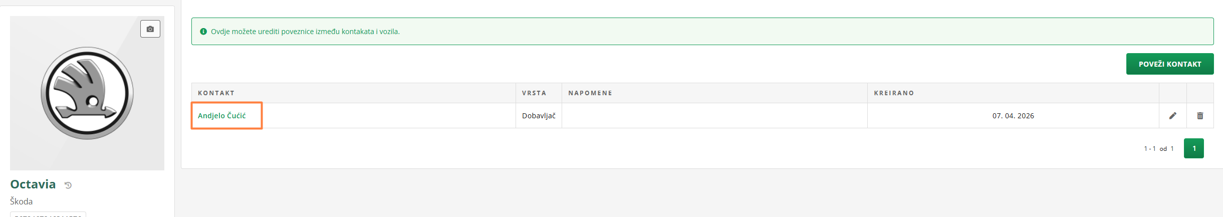 Kontakt se prikazuje i na kartici vozila među Povezanim kontaktima