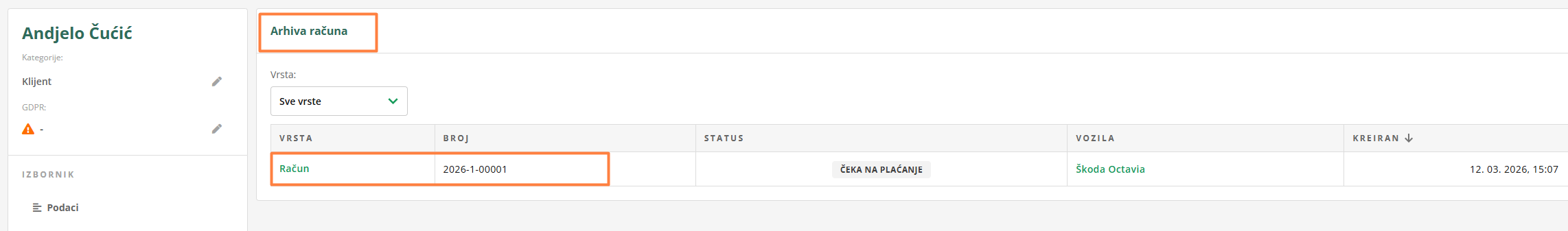 Račun se sprema i na karticu kontakta pod odjeljak Arhiv>Arhiv računa, gdje vam je uvijek dostupan. Isto vrijedi i za predračune, avanse i odobrenja.