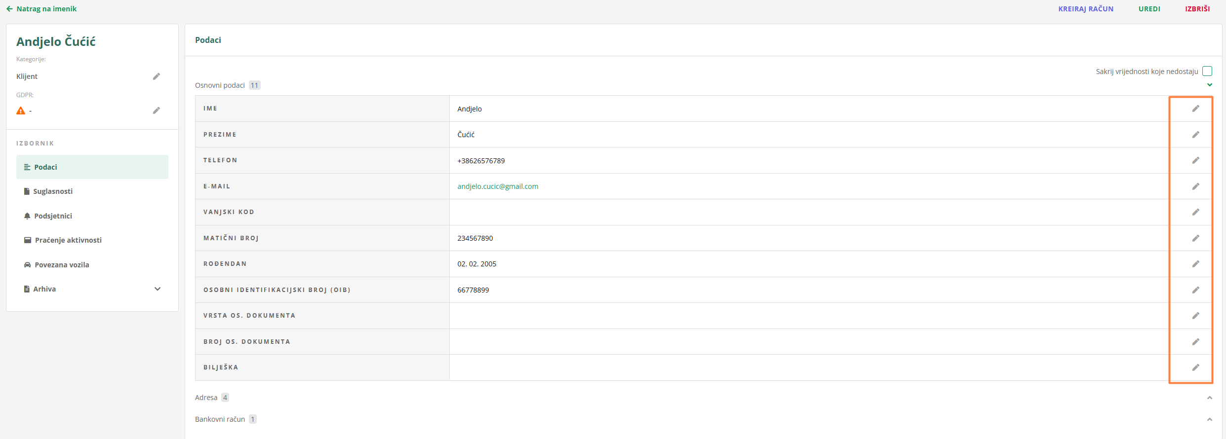 Kontakte možete uređivati u bilo kojem trenutku. Možete im dodavati nove podatke ili im dodavati dokumente i račune.
