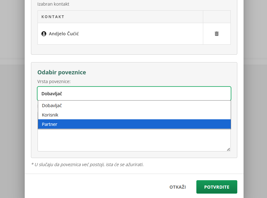 Na kraju odaberite vrstu veze: korisnik, dobavljač ili partner. I zatim kliknite POTVRDI