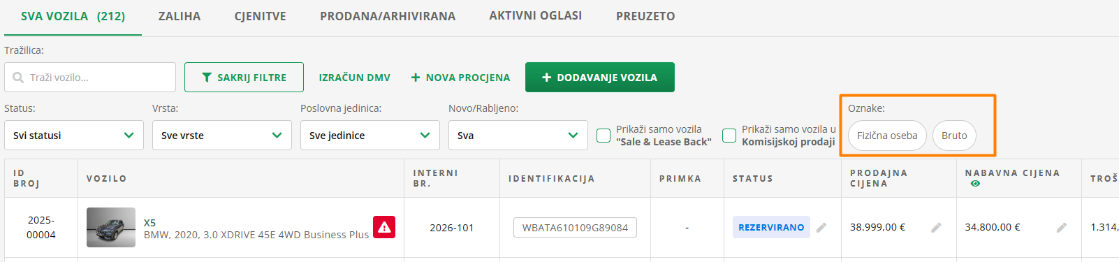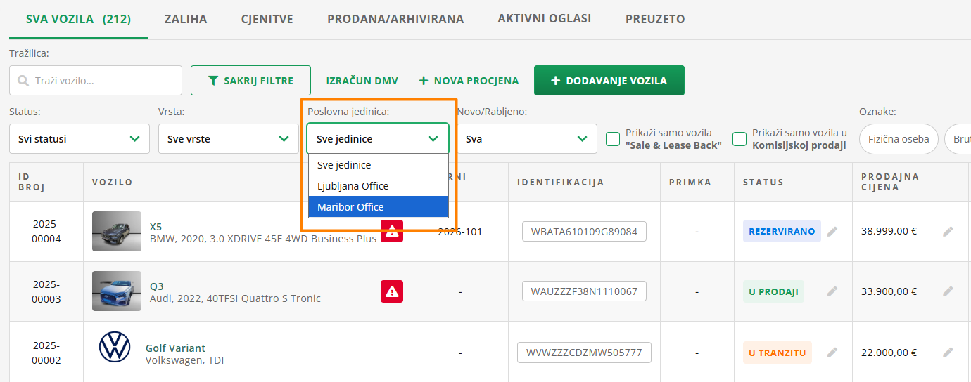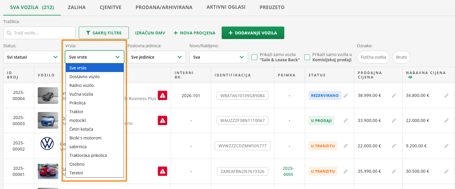 Možete filtrirati i po vrsti vozila, koju označite u procesu unosa vozila u zalihu. I ovaj filtar pronaći ćete u gornjem retku.