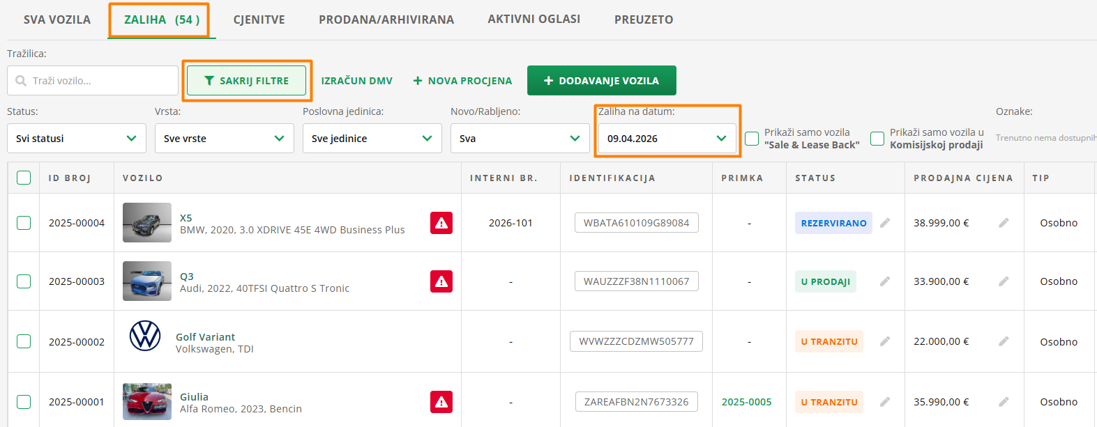 Ako pronađeš filtar s oznakom Zaliha na datum, prikazat će vam se samo vozila koja si imao na zalihi na odabrani datum.