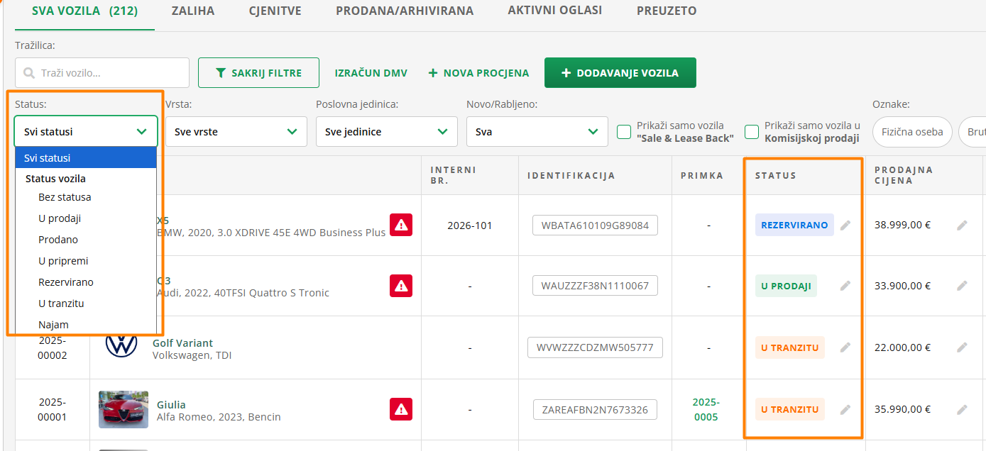 Svoju zalihu možete filtrirati i po statusu. Status možete dodati za svako vozilo u svojoj zalihi tako da kliknete na ikonu olovke pored svakog vozila u stupcu STATUS